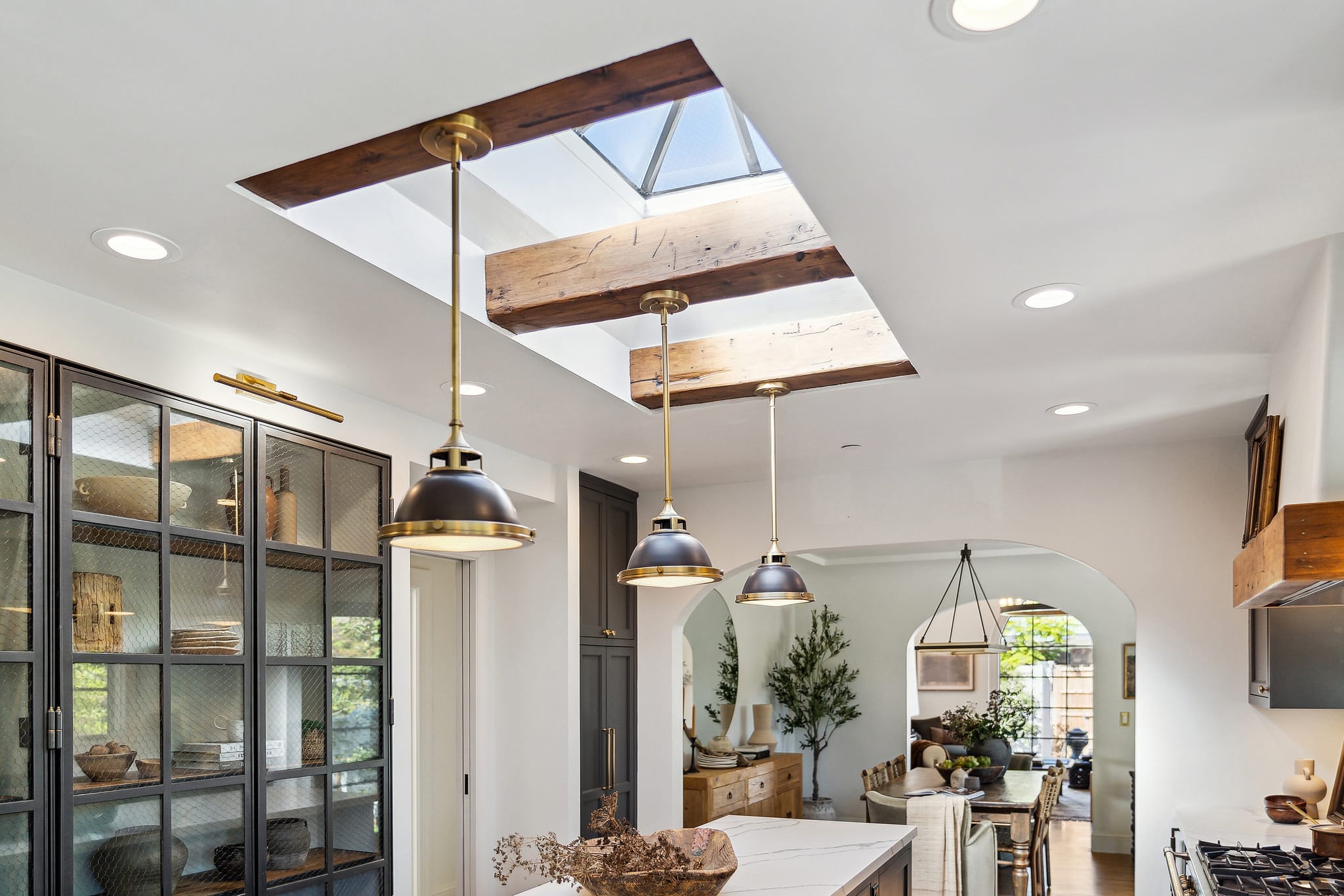 A detail shot looking up toward the dual skylights and exposed wood ceiling beams. The natural light flooding in from above illustrates how ample overhead light is key to making a dark, black-dominant kitchen palette feel expansive rather than heavy.